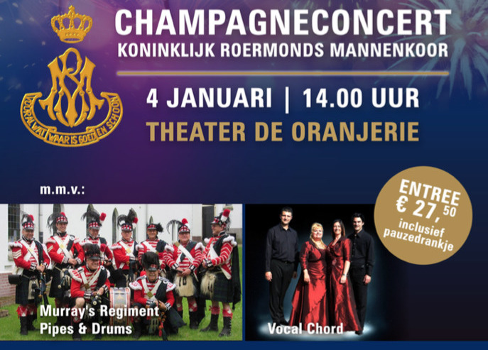 Op zondag 4 januari 2026 opent het Koninklijk Roermonds Mannenkoor (KRM) het nieuwe jaar op feestelijke wijze met het traditionele Champagneconcert. Om 14.00 uur begint het concert in Theater de Oranjerie in Roermond.